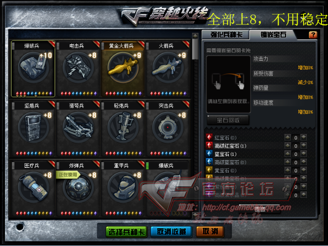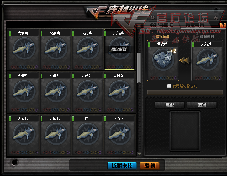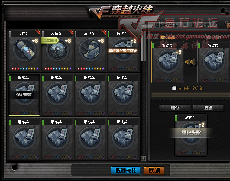 比如你想强化爆破兵,首先你选的是一种火箭兵白卡来强化,如果显示成功,则继续用火箭兵白卡继续强化,直到出现强化失败,一旦出现强化失败,就立即停止使用火箭兵白卡,换另外一种医疗兵或者重甲兵等其它白卡继续强化爆破兵,只要出现强化失败,就立即选择另外一种白卡来强化目标卡片,这样可以最大限度避免强化掉级的几率。