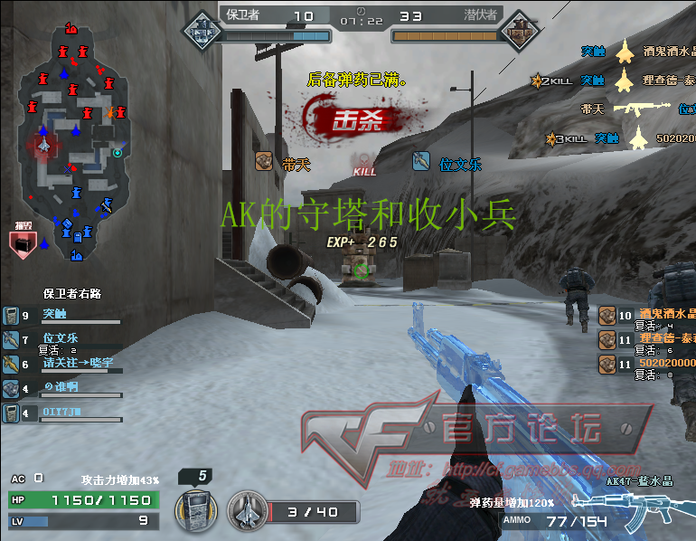 若是一般散人散房,第一波不是强推的情况,打击者和AA-12类似的散弹枪虽说有很强的区域伤害能力,但远距离的伤害极为有限,刚开始的升级不建议用此武器,应使用AK类枪械。这其中,个人又尤其推荐擅长泼射的蓝水晶和点射泼射皆可的火麒麟这两种AK,远距离可收取小兵,近距离也可凭借火力优势(AK枪械的高伤害)能够很好的压制敌方。并且经过多次实战,发现AK类枪械在己方一塔下能够最有效防止敌方强推,较高的伤害和较大的弹匣能够很好的防止敌方偷塔,并且很迅速的跟防御塔抢人头,来获取升级的经验。当然了,会打狙的玩家也可手持大狙防守单路敌方的强推,前提是要有相当高的命中率和输出。这点来说,换弹硬伤的散弹枪不太适合防御。升级过后即可换回高伤害散弹枪,此后,目标就是对防御状态的防御塔造成最大程度的伤害。