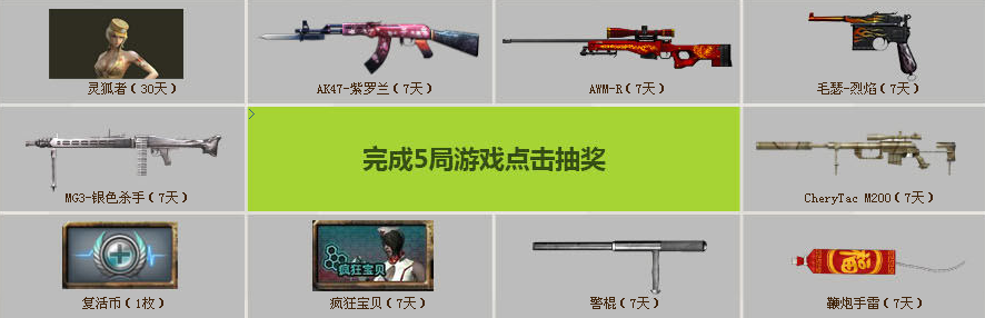 首次创建角色的用户每天完成5局游戏可于次日下午14:00在本页面领取抽奖机会参与抽奖,CFVIP或QQ会员用户可额外获得1次抽奖机会!
