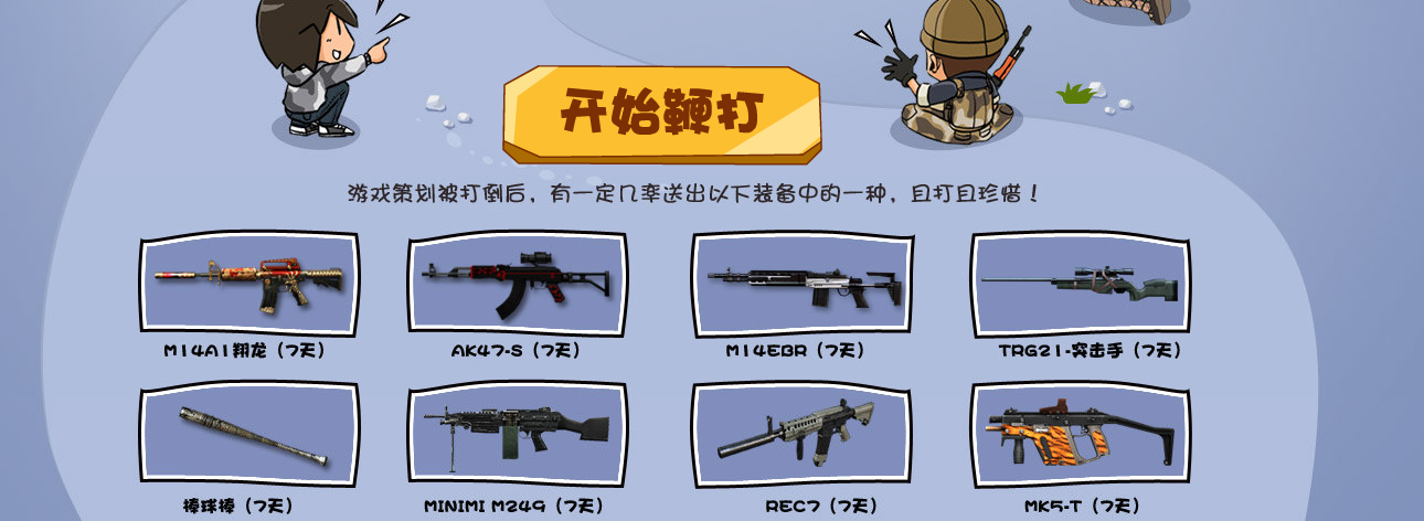1.每日用户均有3次鞭打游戏策划的机会(CFVIP与会员可以多获得一次机会),选择一名游戏策划进行鞭打,策划被打倒后有一定概率送你一件装备哦,没有得到装备也没关系,希望这个活动可以给大家带来欢笑以及CF世界里最初的梦想!