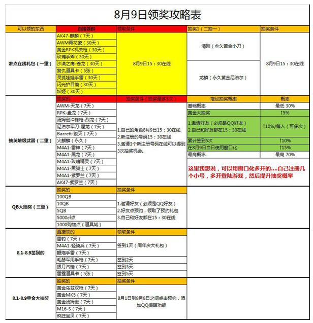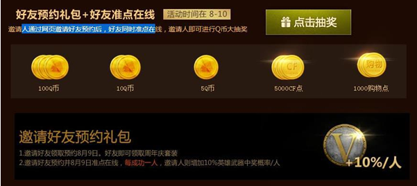 c) 拉上你们的好基友好丽友, 8月9 日15:30,双方一起准点在线,你就可以抱得双重收获归家呢,哪双重?首先最厚道的就是抽QB的回馈,然后就是英雄枪抽奖概率增加10%每人,只要你邀请了n个好友, 他们同时都预约了活动,这n个好友还如此厚道的和你一起同时在线,你的抽奖机会就会增加到n%,这是什么概念?请聪明的小伙伴自己想一想,超酷有没有?
