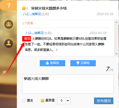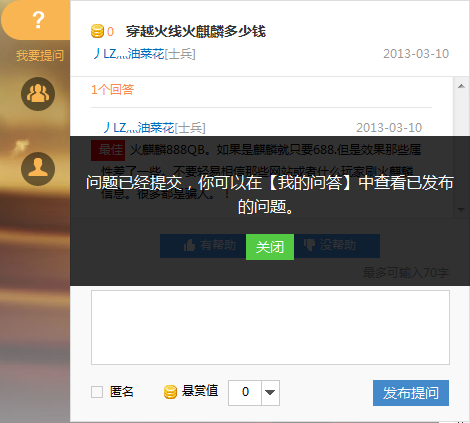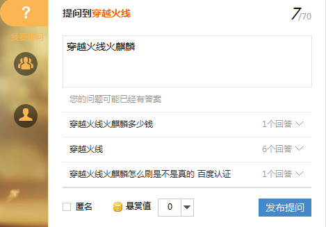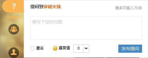点击“我要提问”,会打开提问到“地下城与勇士”的窗体,在问题输入框内填写少于70个汉字的问题。并且可选择是否匿名发问,或是给问题设置悬赏值。