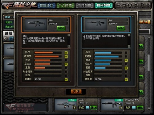 XM8拥有着400米的有效射程,枪身重量2.6KG(M4A1的重量是2.68公斤),和M4A1一样使用5.56×45mm弹药。CF中售价14500GP。