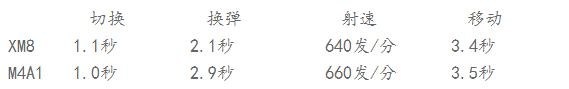 从速度上来看,XM8在切换上稍逊M4A1,但是在换弹速度上则完爆M4A1(GP版),在射速上XM8远远低于M4A1,这也是XM8在速点上弹道更好控制的原因,轻化的枪身让XM8有着较快的移动速度,更利于在战场上的机动性能。