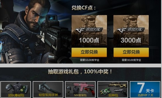 CF游戏点券、团队爆破包、轻型军用手斧、M4套装包、狙神包任你来拿!