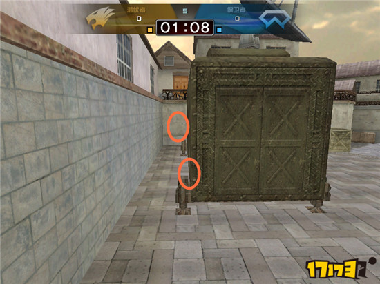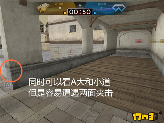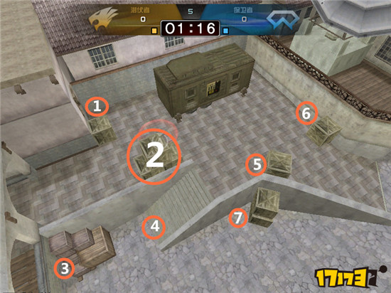 总算是历经千辛万苦到达了A平台,但前方的路依然充满荆棘。首先要在过盲点的时候就要注意图二的小道1、2、3柱和图1的2、3、4、5、6、7位。一般的,对于这些点都是打提前枪,边走边对这些点预点,每个点点2到3下即可,对于箱子后的2、5、6、7位更应多点几下。这里和大家特别提示一下6、7两个位置,这两个点必须要扫射或者怒点10下才可。原因是一般阴险的保卫喜欢和你玩心计,利用听声辩位来判断潜伏的具体位置,然后拉出去清人,到时怪队友也无济于事了。