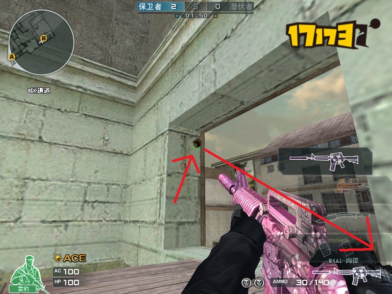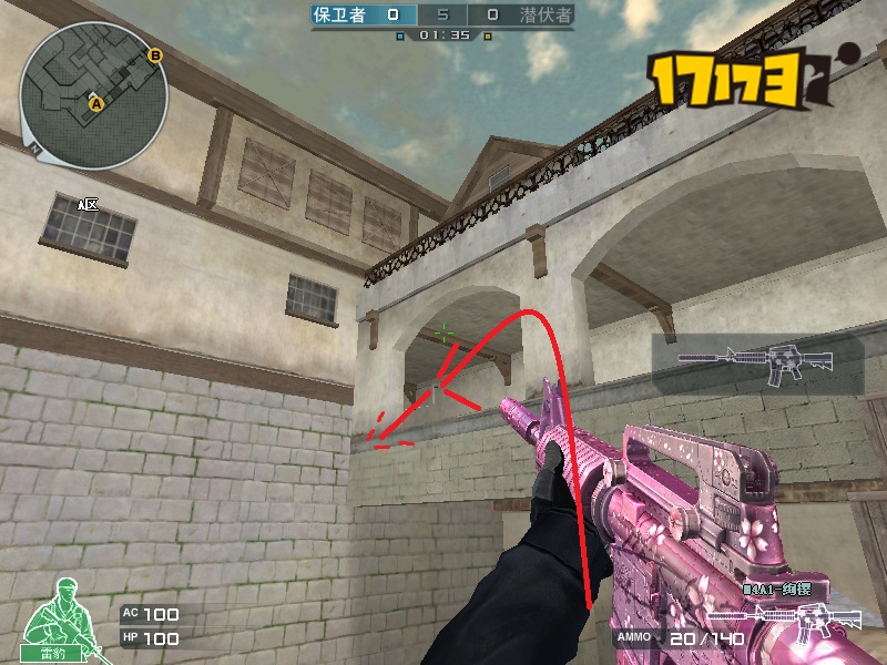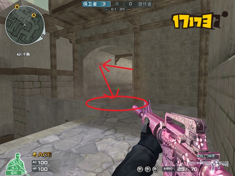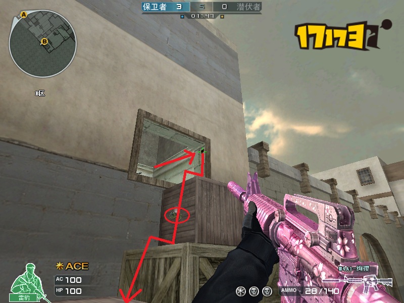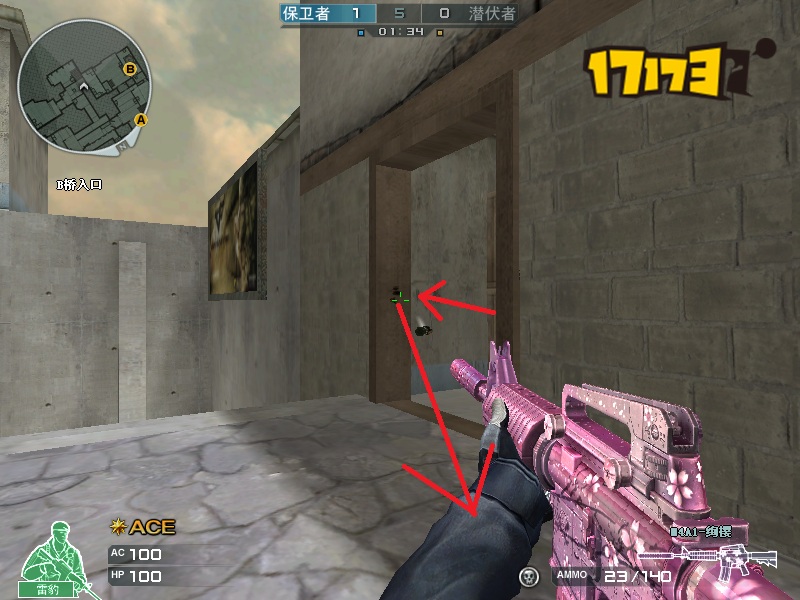 大家看上图我给出的扔雷路线,我现在站的是A斜坡楼梯的位置。别在桥下直着扔。离桥太近的话雷没有弹进去的角度。现在告诉大家的技巧就是从楼梯冲下去把雷高高的甩到我箭头所指的墙的位置,大概那个位置左右就行,雷的抛物线一定要高,落点一定要尽量靠前。要不弹不进去。