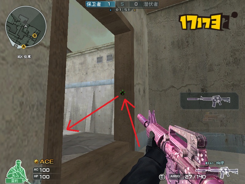 潜伏在进攻的时候,大部分也是不会直接进B仓库的。肯定会选择在水的楼梯这或者门洞的左侧死角这卡点,提醒开局上来千万别离门洞太近,对方如果有人攻仓库的话肯定先往门里扔雷,在门口肯定挨炸。站在门的这一侧,一方面可以看着从B水上来的敌人一方面可以阴着要直接进门的敌人。在确定有人在门口卡位的时候大家可以用一个雷,就照着我图上瞄的位置扔到门框上。让雷反弹回旁边的死角,那里卡着的人妥妥的中招。不死也大残,绝对剩不了40HP。