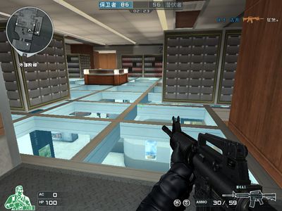 上下两层隔断,上面有透明玻璃可以观察到下面的战况,但是不可以穿透玻璃进行攻击,但是有2个破碎的玻璃窗口可以进行射击。这2个窗口的占领非常重要,可以引导比赛的胜利或者失败。