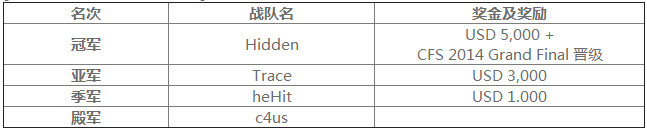 6支参加队中,最终获得CFS 2014韩国区总决赛的就是“Hidden”战队,Hidden曾经是CFS第一赛季的韩国代表队。在第二赛季的选拔赛中惨遭淘汰,如今他们卷土重来,为我们带来了韩国战队崭新的面貌。