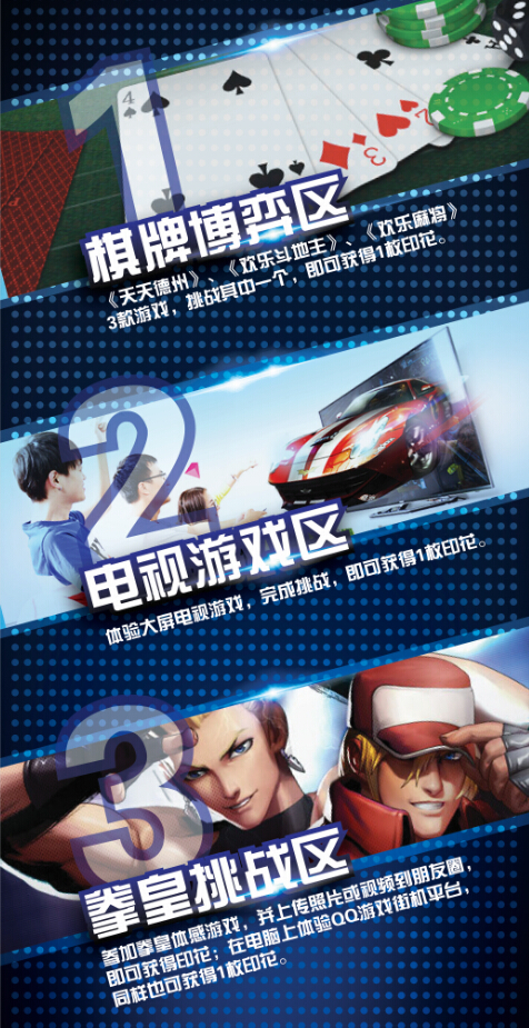 QQ游戏展区将构筑成一个奢华的“皇家俱乐部”,让玩家身临其境感受到嘉年华“一起High”的氛围。展区的主体是在现场独树一帜的两层结构,划分为棋牌区、电视游戏区、街机区三大分区。展区内不但包括耳熟能详的《欢乐斗地主》、《天天德州》等经典产品,更有腾讯电视游戏、QQ游戏街机平台、以及斗地主3D等新产品参展。多种现场游戏互动多种多样,带给玩家无限欢乐,使大家一个展区过足瘾!完成3个关卡还有超值周边礼包随机发放。皇家俱乐部灯火通明不打烊,快乐秘宝等你拿。
