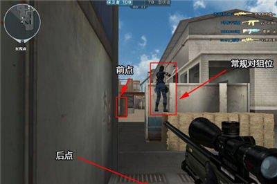 如图所示医院前的对狙位。在这个位置基础上又可以调整位置卡前点和卡后点。前点专门对付挡板掩体后露头的狙击手和兼顾中路突破的敌人,缺点是离敌人距离近,容易被雷和被步枪突击。后点专门对付站挡板旁的狙击手,因为站位靠后偏离敌人的预瞄点且不会被挡板的敌方狙击手发现,因此相对安全。