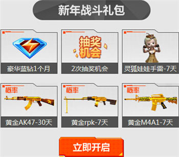 2.立即支付15Q币,开启CF新年专属礼包,获得2次抽奖机会+豪华蓝钻1个月+灵狐娃娃手雷7天!并概率获得逆天黄金枪!