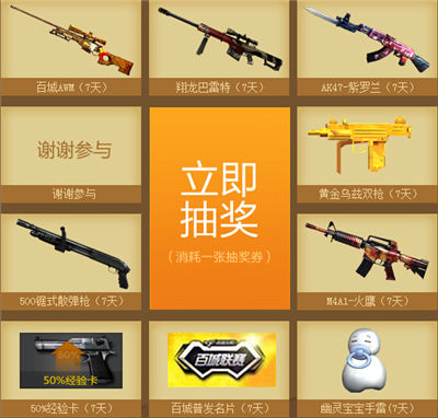 活动期间参与活动所获得的抽奖券即可在下方左侧进行抽奖,获得道具请到游戏仓库查看,同时在本页面开通一个月超级会员享受超会服务+M4A1-QQ会员(7天)+百城名片(7天)