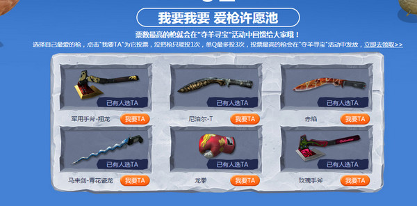 票数最高的枪就会在"夺羊寻宝"活动中回馈给大家哦!选择自己最爱的枪,点击"我要TA"为它投票,没把枪只能投1次,单Q最多投3次,投票最高的枪会在"夺羊寻宝"活动中发放。