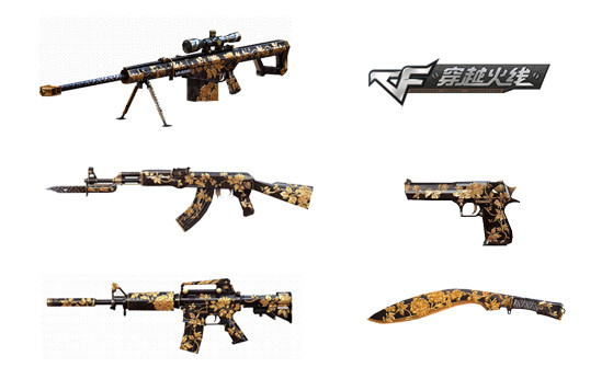CF将新推出牡丹系列枪械,包括M4A1、AK47、Barrett、沙鹰、尼泊尔在内的经典武器,都将成为牡丹系列中的新丁。黑色底色与金色牡丹的相结合,让整款系列枪械彰显富贵之气。