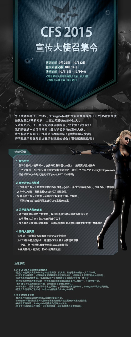 CFS 2015特别发起宣传大使召集活动,如果你是游戏战术分析家,视频图片制作达人,又或者拥有粉丝众多的论坛和微博,就快加入我们吧!现在报名宣传大使活动,就有机会赢取亲临世界总决赛的机会,主办方将全程提供机票及食宿!好机会不要错过!!