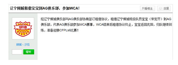 AG电子竞技俱乐部:AG电子竞技俱乐部与倾城电子竞技俱乐部友好协商,于2014年9月23日达成了以下租借协议:租借辽宁倾城现役队员宝宝(宋洪齐)到AG俱乐部,代表AG俱乐部参加WCA赛事,WCA结束后租借协议终止,宝宝返回倾城,归队继续训练,准备迎接CFPLs6比赛!AG电子竞技俱乐部感谢倾城俱乐部的帮助和支持,在最短时间内达成租借协议,并提交联盟。