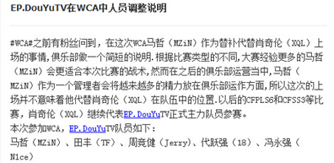 EP.DouYuTv:在这次WCA马哲(MZiN)作为替补代替肖奇伦(XQL)上场的事情,俱乐部做一个简短的说明.根据比赛类型的不同,大赛经验更多的马哲(MZiN)会更适合本次比赛的战术,然而在之后的俱乐部运营当中,马哲(MZiN)作为一个管理者会将越来越多的精力放在俱乐部运作方面,所以这次的上场并不意味着他代替肖奇伦(XQL)在队伍中的位置.以后的CFPL S6和CFS S3等比赛,肖奇伦(XQL)继续代表EP.DouYuTV正式主力队员参赛。