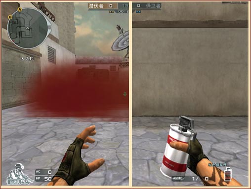 红色烟雾弹:用手投掷的小型烟雾弹,会扩散出红色的烟雾,主要用于阻碍敌人视野。 |